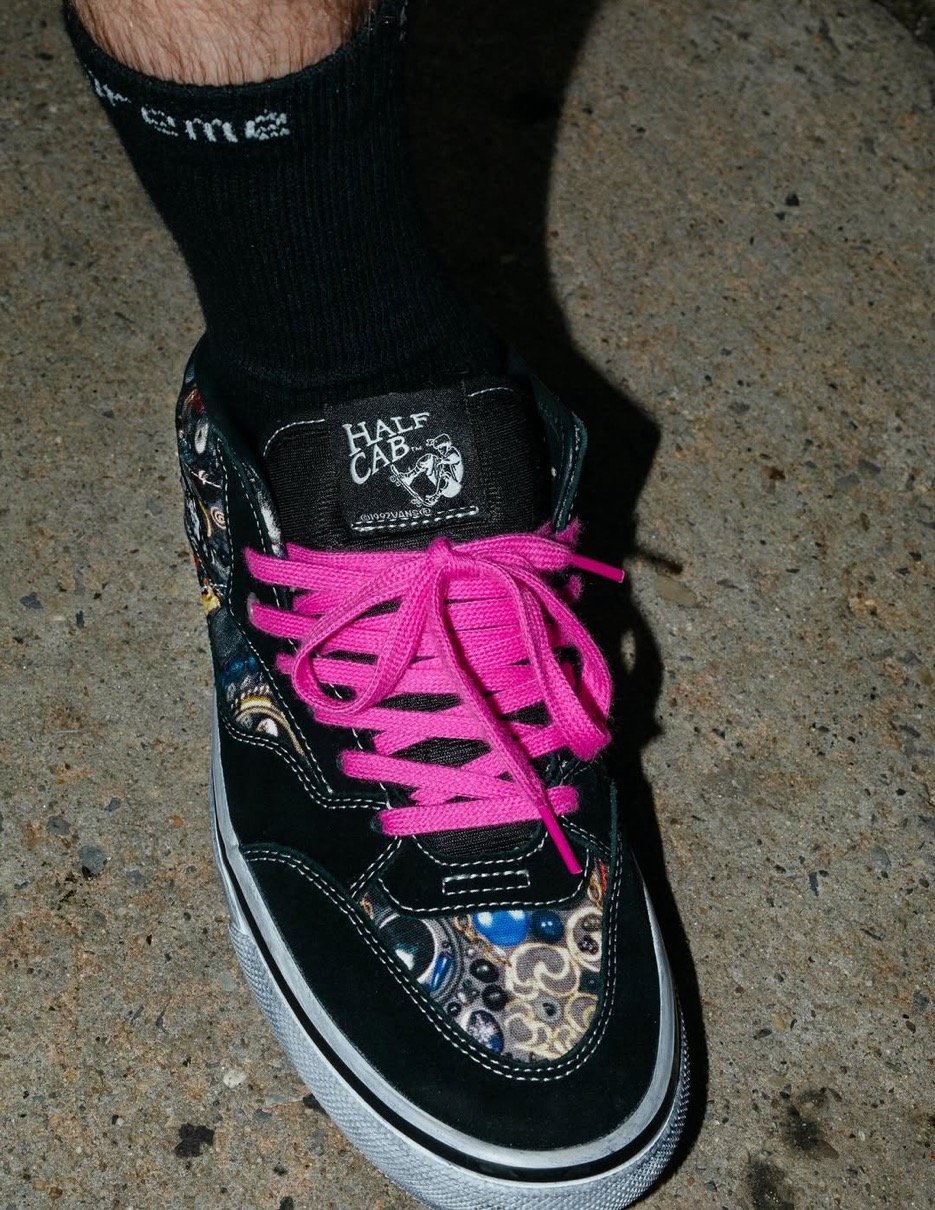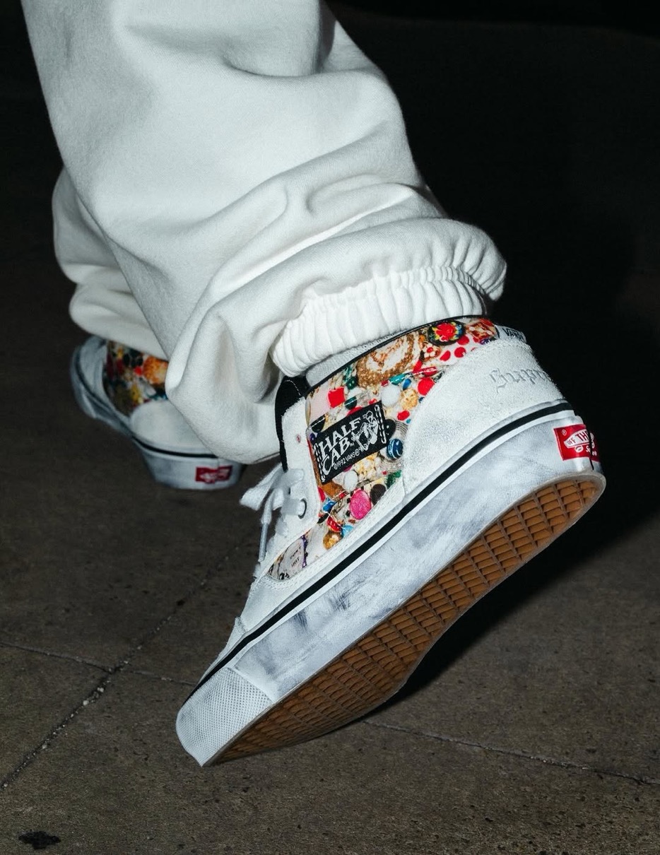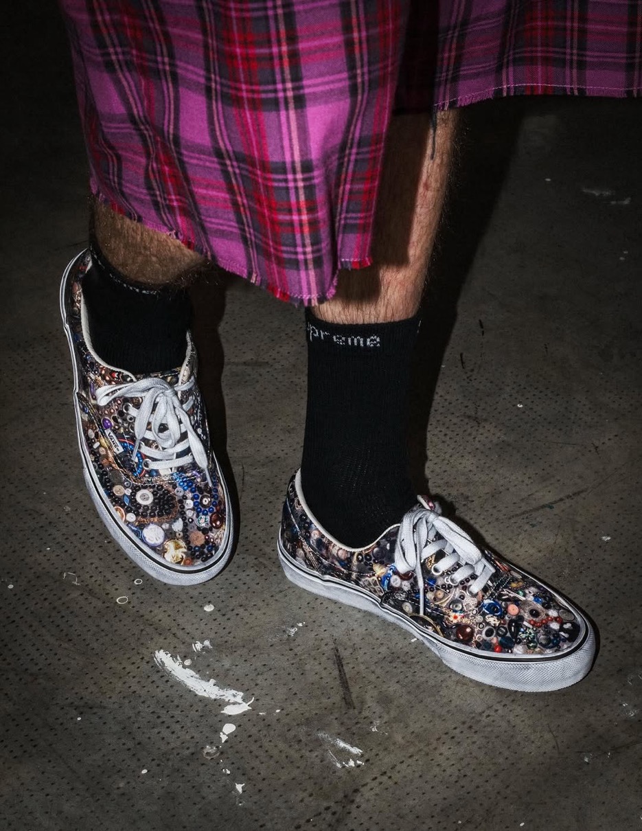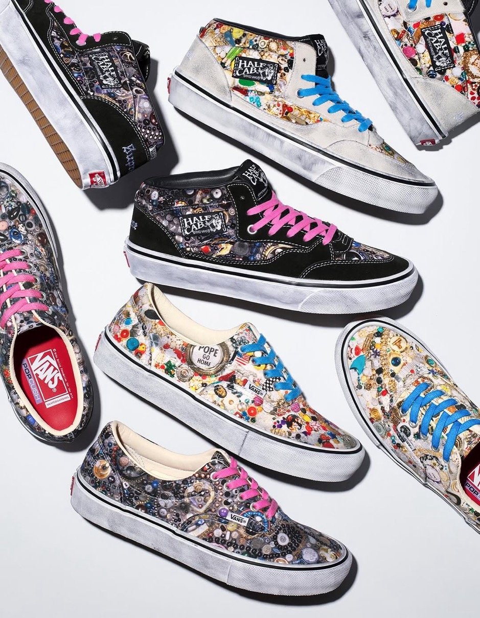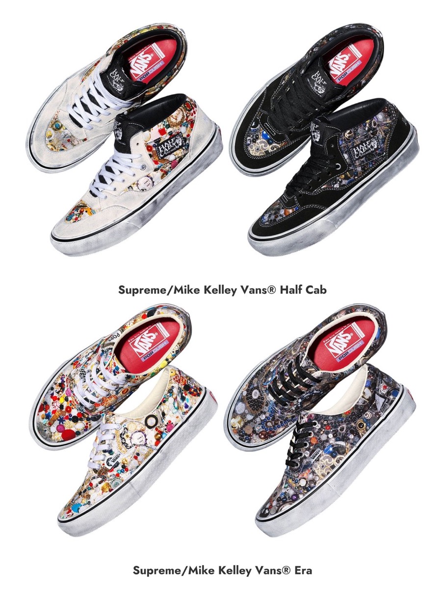 今週は、アメリカの現代美術家Mike Kelley(マイク・ケリー)の精神を継承・発展させているマイク・ケリー芸術財団(Mike Kelley Foundation For The Arts)およびアメリカ発の王道シューズブランド「VANS(ヴァンズ)」とコラボレーションし、マイク・ケリーによるオリジナルアートワークをあしらった「Half Cab(ハーフキャブ)」と「Era(エラ)」のトリプルコラボモデルが公式発表。「ハーフキャブ」はプレミアムスエードとキャンバス製のアッパーを採用し、「エラ」はキャンバス製のアッパーを採用。両モデルとも、レザー製のライニングとインソール、加硫加工されたワッフルアウトソール、そしてかかと部分に刺繍ロゴが入った特製ヒールラベルが特徴。シュプリーム限定で展開される「ハーフキャブ」と「エラ」は、それぞれ2つのカラーバリエーションで展開される。