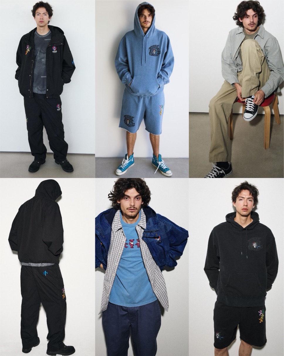 今回はバンドを象徴するマスコットキャラクターである踊るクマ「Dancing Bear(ダンシング・ベア)」や、稲妻の走る髑髏「Steal Your Face(スティール ユア フェイス)」のモチーフを落とし込んだシェルジャケットやフーディー、パンツ、Tシャツなどを展開。