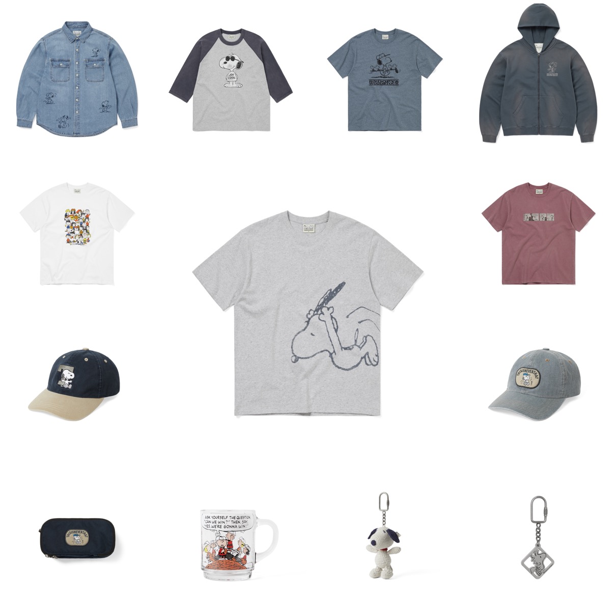 両者にとって初となるコラボでは、スヌーピーと愉快な仲間たちのグラフィックを使用したTシャツ、デニムシャツ、フーディー、スウェット、キャップ、キーリングなどがラインナップ。