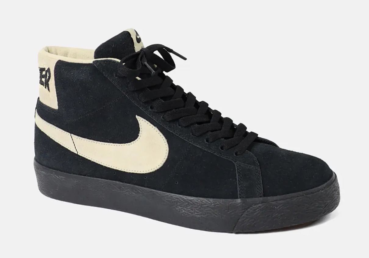 今作では1972年にナイキ初のバスケットボールシューズとして登場した「ブレーザー(Blazer)」のSBミッドカットモデルをベースに採用。2006年にリリースされたコラボモデルのカラーを反転させ、ブラックのスエードアッパーにオフホワイトと淡いゴールドのアクセントを配している。かかとに刻まれたスラッシャーのブランドロゴが、このスニーカーのルーツを明確に示している。