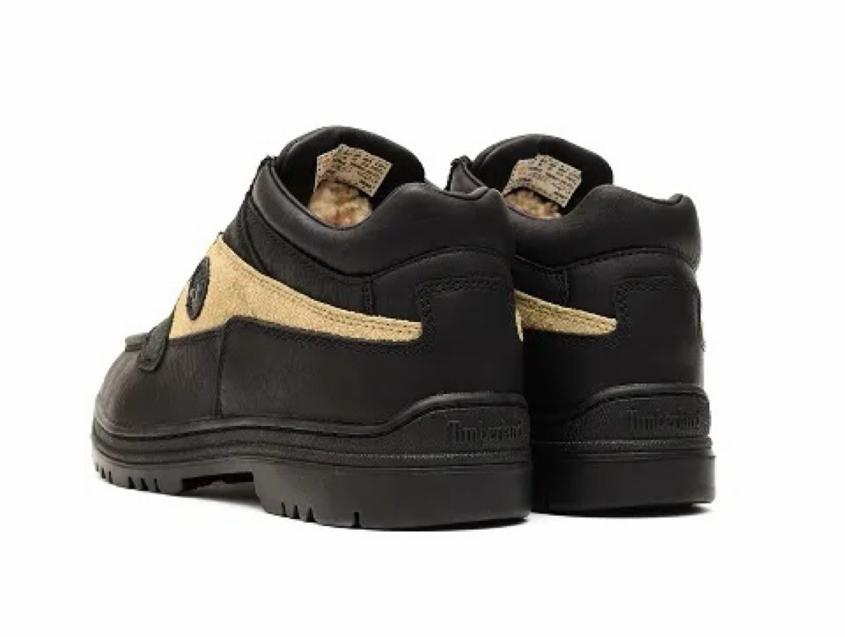 野生動物をイメージしたコンビネーションカラーで全体を仕上げ、アッパーのメイン素材に独特なシボ感のブラックレザーを採用しながら、バンプとシュータンの一部をハラコ素材に変更し、サイドパネルには毛足の短い上質なカウスエードを用いることで、無骨さと上品さが共存する1足に仕上げている。さらに、ライニングとインソールをボア仕様とすることで快適な履き心地と保温性を実現し、付属するアッパーと同素材のハングタグには両者のロゴを型押しした。