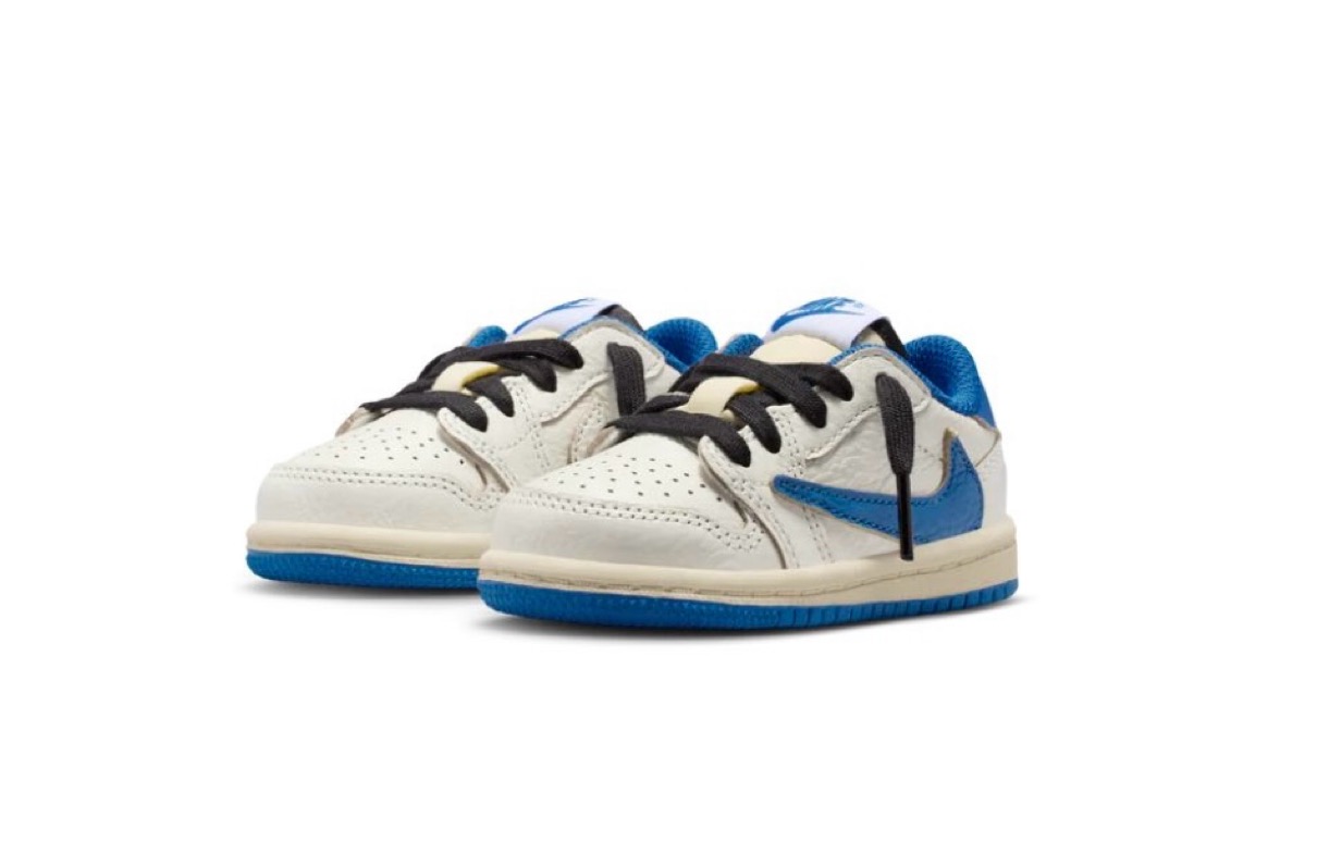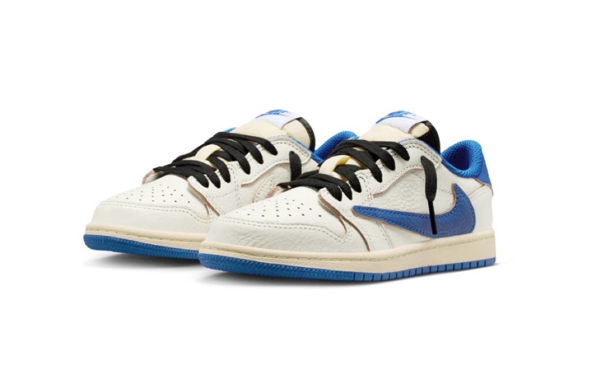 トラヴィス・スコット × ナイキ x フラグメント コラボスニーカー AJ1(エアジョーダン1) ロー オージー エスピー “セイル/ミリタリーブルー”がファミリーサイズ展開で登場。[DM7866-104]