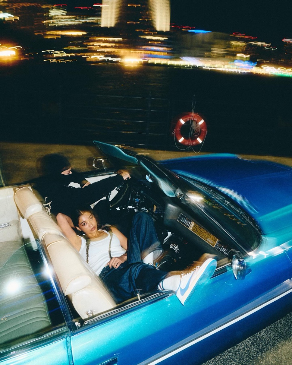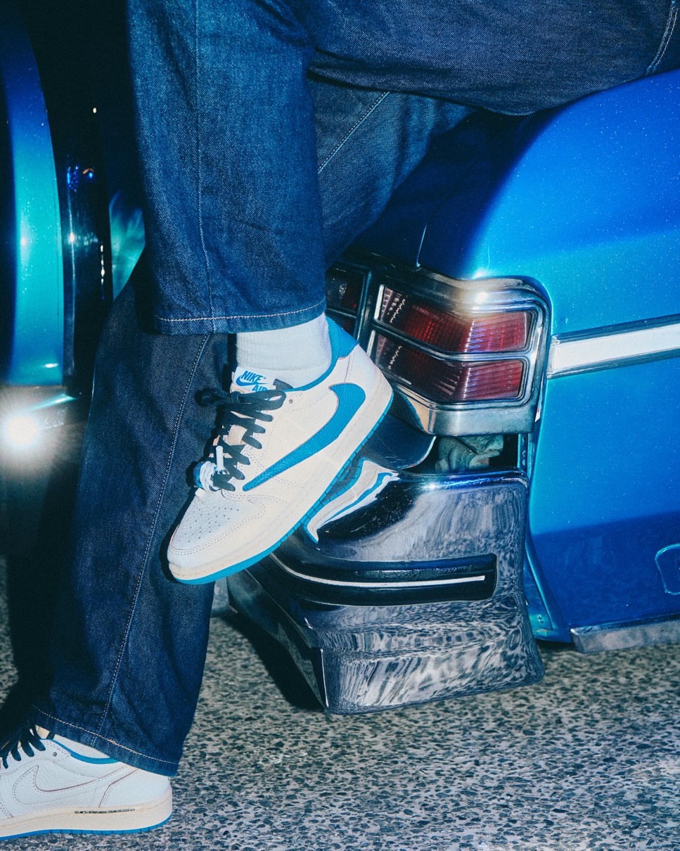 フラグメントを含めたトリプルコラボの新作では、以前藤原ヒロシ本人が着用した Nike × Travis Scott × Fragment Air Jordan 1 Low OGを彷彿とさせるセイル/ミリタリーブルーのカラーリングが特徴的。オーバーレイのエッジと経年変化を表現したミッドソールが微かなヴィンテージ感を演出し、ヒールに配されたウィング、CactusJack、フェイスマーク、サンダーロゴが三者のアイデンティティを表現。シューレース部には編み込んだレースアクセサリーが付属する。
