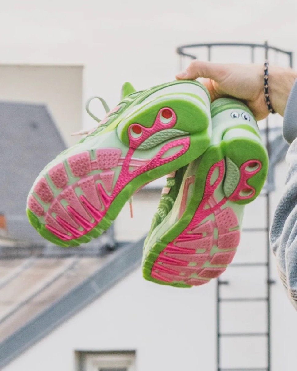 アッパーはグリーンカラーが基調で、スリーストライプスとアウトソールに配されたソフトピンクのアクセントがバランスを取る。網目状のメッシュベースが質感と通気性を加え、シュータンには豚のマスコットが再登場。ヒールには刺繍の目が施され、さりげないキャラクター性を演出。こうしたディテールが、ピギーランナーシリーズを創造性豊かに保ちつつ、ファッションの起爆剤としても機能。着用のしやすさを維持しながら、紛れもない「Unheardof」らしさを保っている。デザインには文化的深みも込められており、初代ピギーランナーはシンシナティの「ポークポリス」の歴史と個性というテーマを引用。新たなグリーンパレットでは進化を示唆しつつ、その物語の核を保持している。
