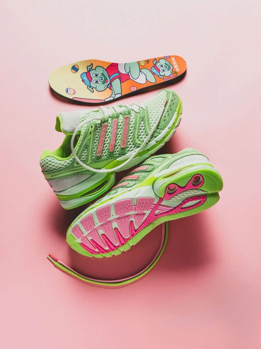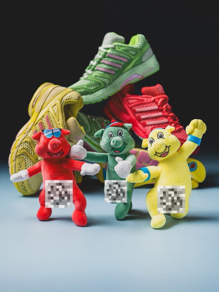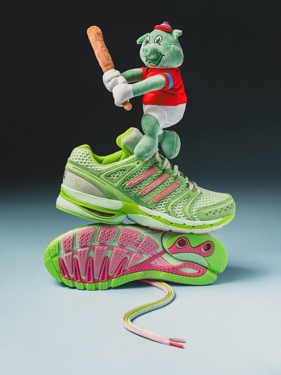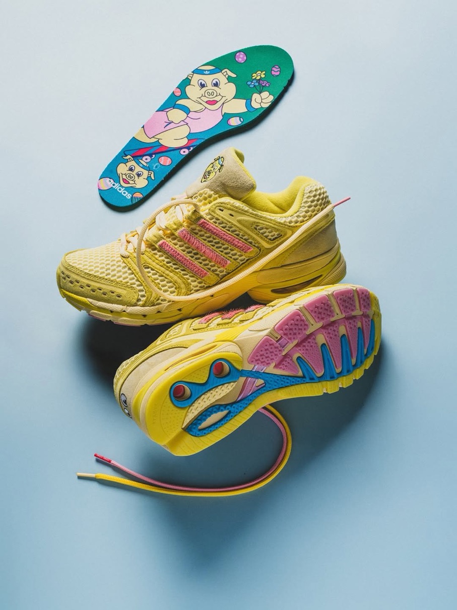 Adistar Cushion 3(アディスタークッション3)をベースにした初代Piggy Runnerに続く今回は、チーズバーガー(イエロー)、カップケーキ(グリーン)、スティーブ・オー(レッド)といった3匹のブタのキャラクターをイメージした3つのカラーウェイを用意。創設者の物語から直接着想を得て製作されたというこれらのスニーカーは、現代のメッシュランニングトレンドを超えた深みとストーリーを持っており、単なる一足のスニーカーを超えて共鳴する逸品。かつて誤解されていたあの子供たちが、今や未来を築く。そんなピギーズの世界観を表現している。
