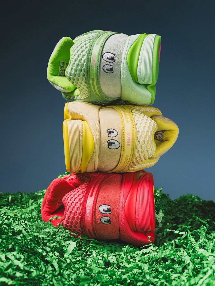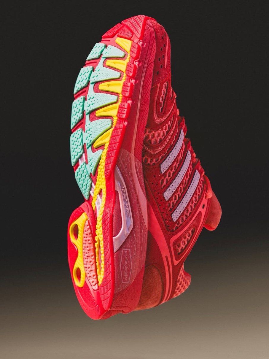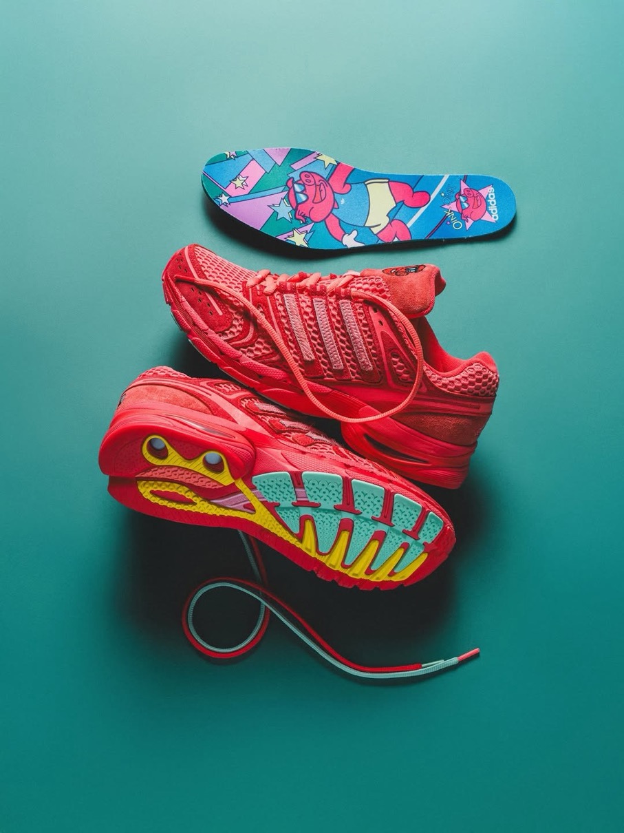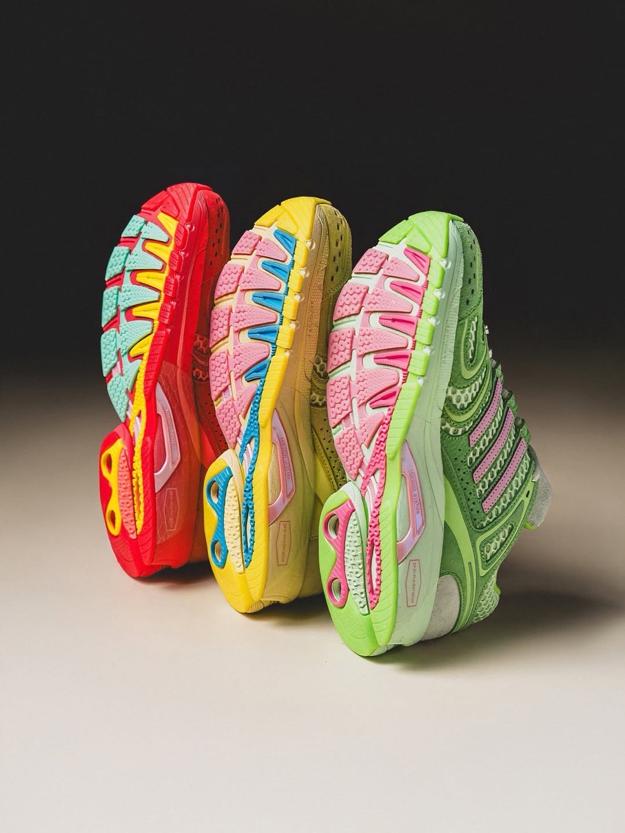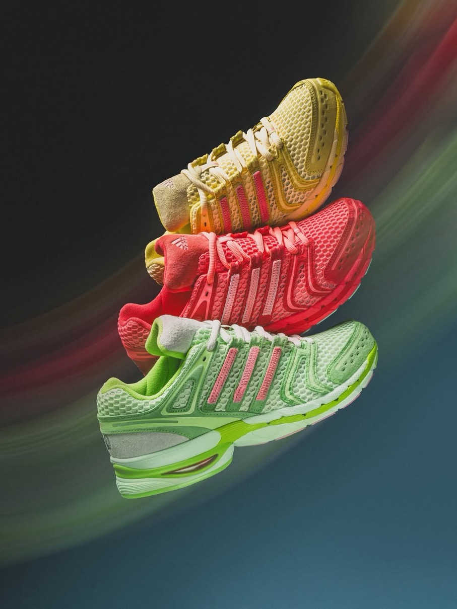 Adistar Cushion 3(アディスタークッション3)をベースにした初代Piggy Runnerに続く今回は、チーズバーガー(イエロー)、カップケーキ(グリーン)、スティーブ・オー(レッド)といった3匹のブタのキャラクターをイメージした3つのカラーウェイを用意。創設者の物語から直接着想を得て製作されたというこれらのスニーカーは、現代のメッシュランニングトレンドを超えた深みとストーリーを持っており、単なる一足のスニーカーを超えて共鳴する逸品。かつて誤解されていたあの子供たちが、今や未来を築く。そんなピギーズの世界観を表現している。