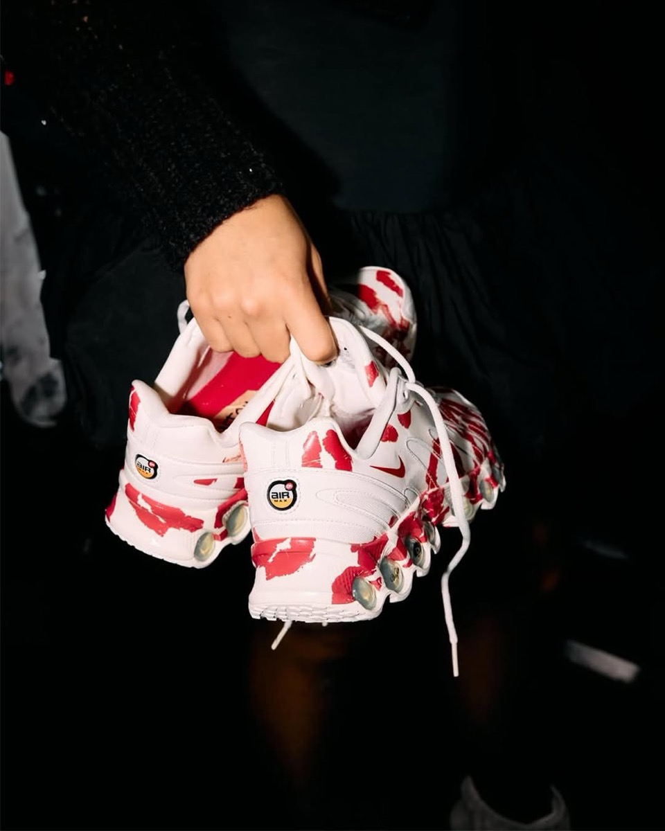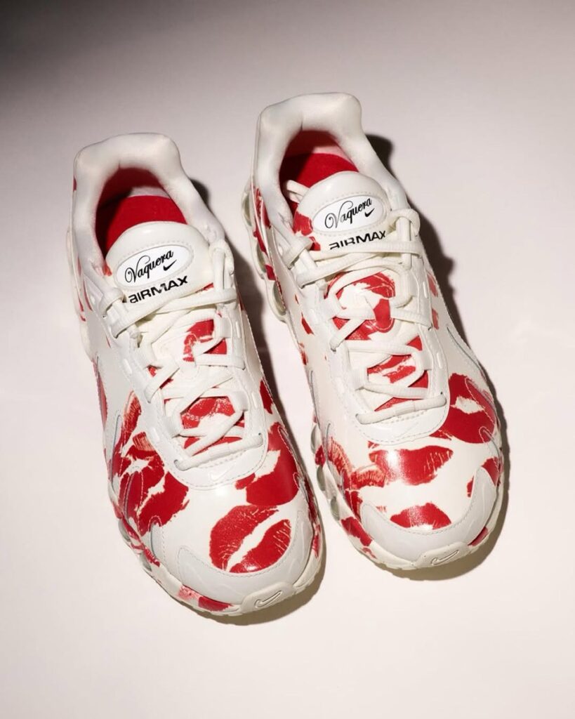 パリファッションウィーク、Vaquera 2026SS Collectionのランウェイでお披露目された一足でベースとなるのは、Nike Air Max Dnのアップデートモデル『Nike Air Max Dn8』。新たなNike Airの革新の始まりを感じさせる今作では、ミッドソールに搭載するデュアルプレッシャーチューブのDynamic Air(ダイナミック エア)ユニットシステムを倍増し、Air Max Dnの倍である8つのビジブルエアが見える迫力抜群の外観に。足を動かすと空気がエア ユニット内のチューブ間を自由に流れ、動いている足からの圧力にエアが反応する。コラボモデルではセイルのシューズ全体にプライムレッドのキスマークグラフィックをプリント。シュータンにはVaqueraのロゴをあしらった。