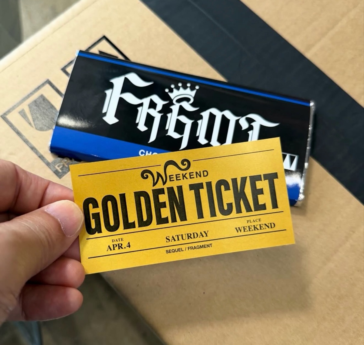 原宿のウィークエンドで、特別なスニーカーの購入権をGETできる『ゴールデンチケット』入りのフラグメントチョコが配布。