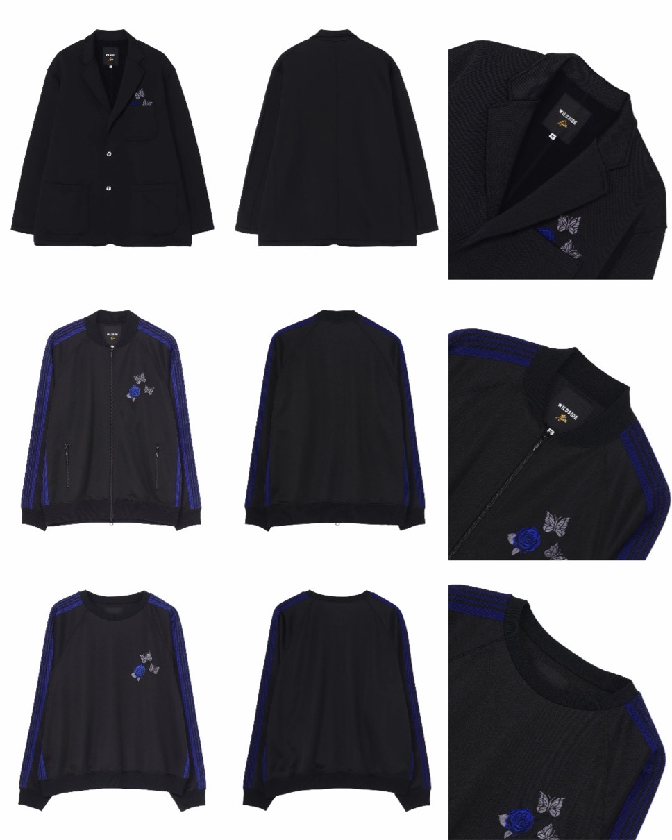 今回の新作コラボレーションでは、WILDSIDEを象徴する薔薇とNEEDLESを象徴する蝶の刺繍を大胆に配し、鮮やかなブルーをアクセントカラーにした全5型のアイテムが登場。NEEDLESを象徴する蝶の位置を変更し、薔薇の周りを2匹の蝶が舞っているかのように配置し、コラボレーションを象徴した特別仕様に仕上げている。ゆとりのあるシルエットが特徴的な3B ジャケットは、薔薇と蝶の刺繍が胸ポケットから美しく覗くよう配置。また、ポリエステルと綿を混紡したブライトジャージ素材を採用することで、上品な光沢感と柔らかで快適な着心地を両立した。