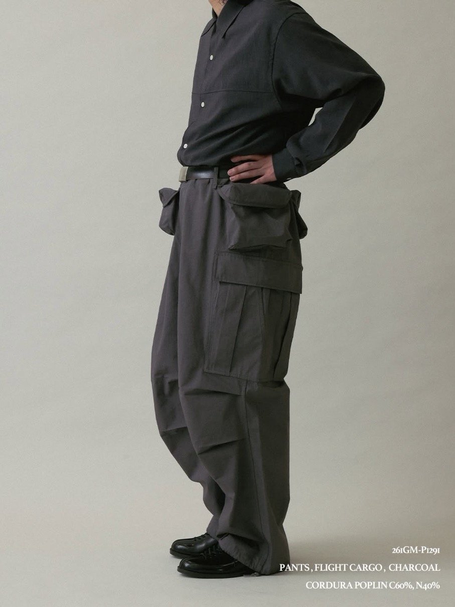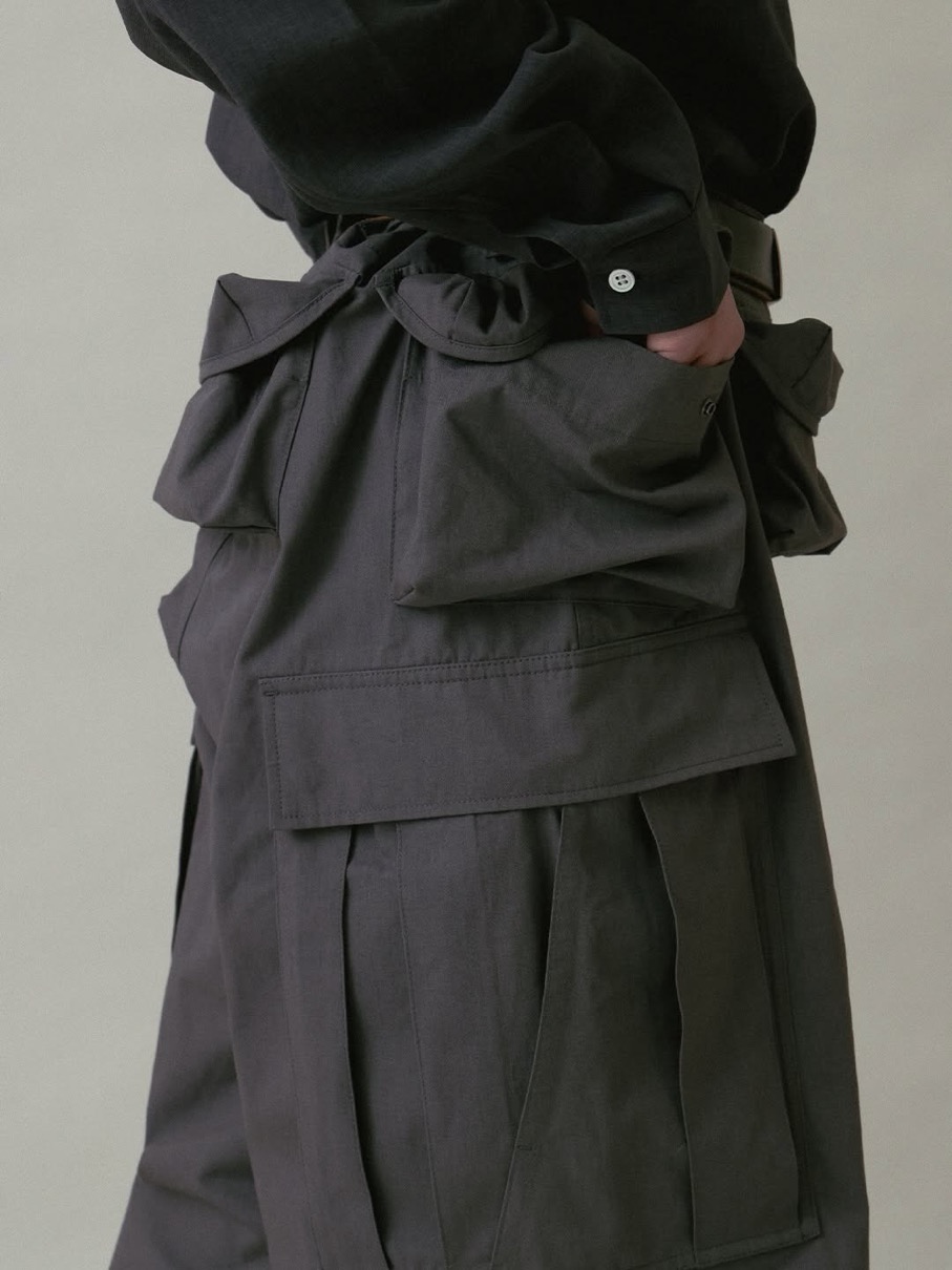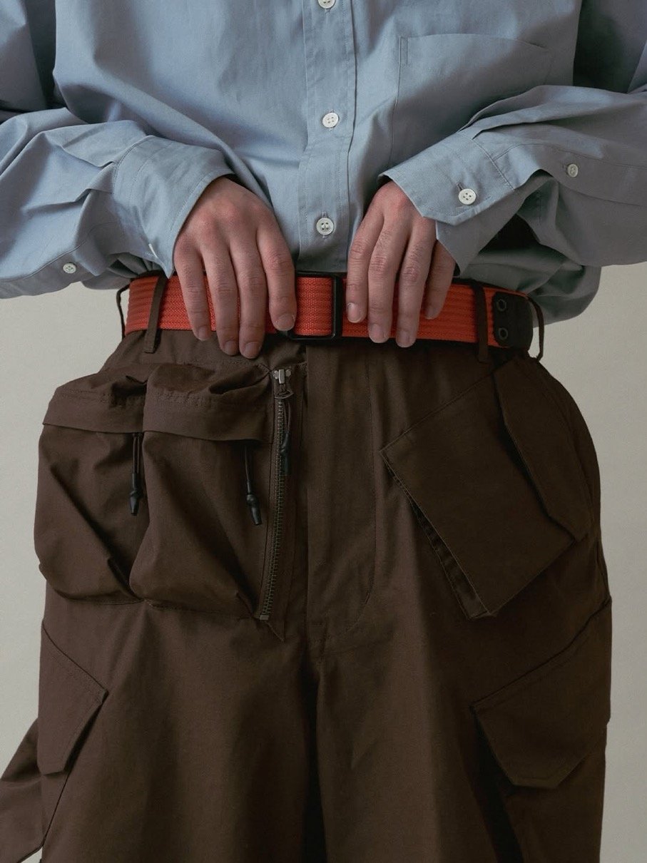 フライトベストのポケットを腰回りに配し、脇にはカーゴポケットを配置。ディテールはミリタリー由来。全体をテック寄りにアレンジした一着。