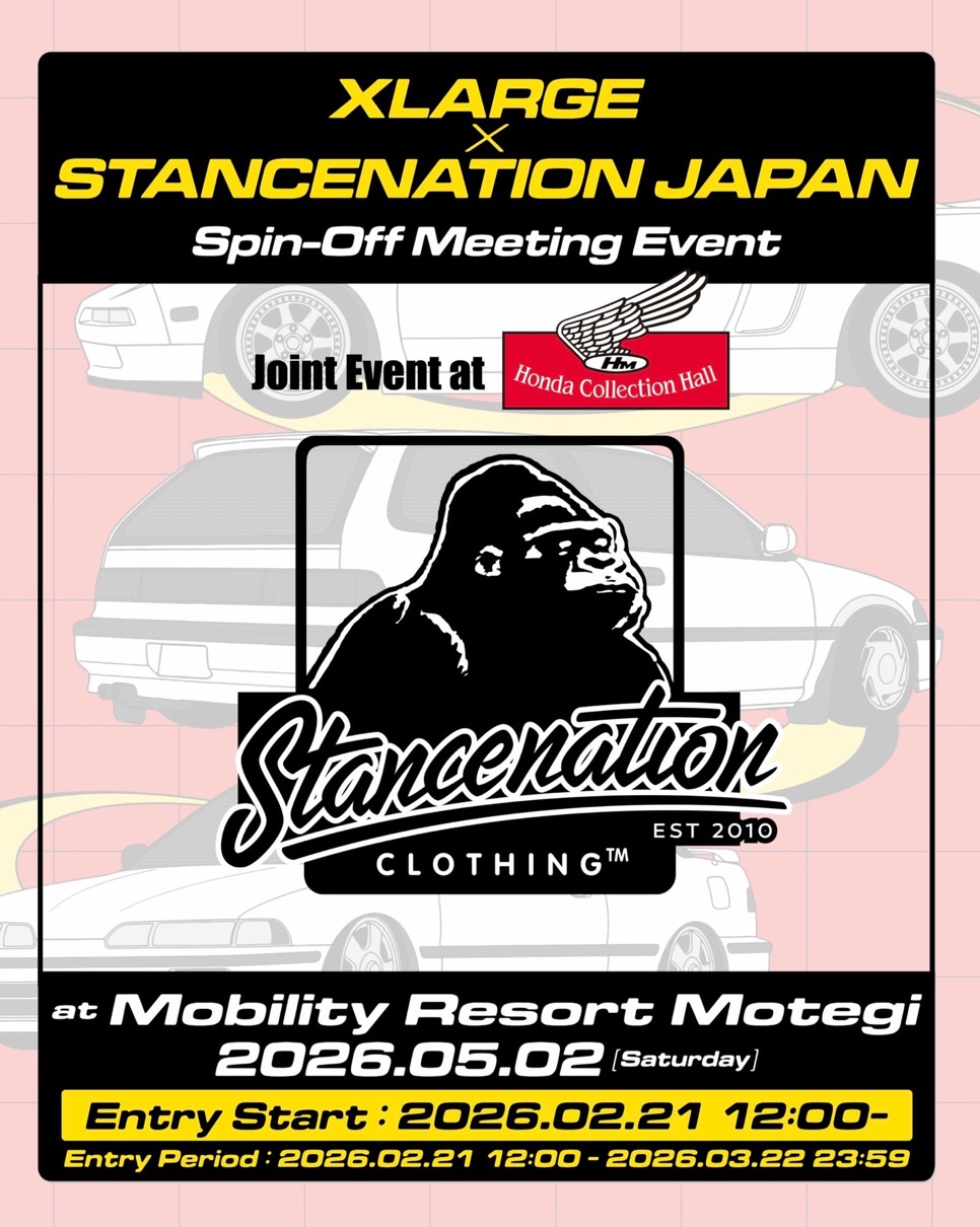 XLARGE × STANCENATION JAPAN SPIN-OFF at Motegi Mobility Resort Joint Event at Honda Collection Hall は、スタンスネイションジャパン「Formrun」にてエントリー受付中。エントリー期間は、2/21(土)12:00 ~ 3/22(日)23:59まで。