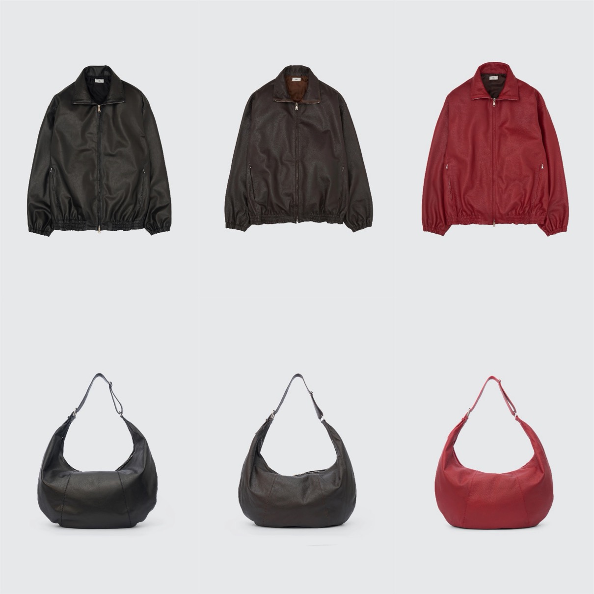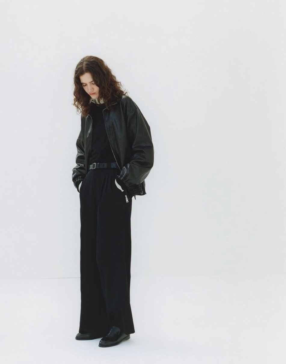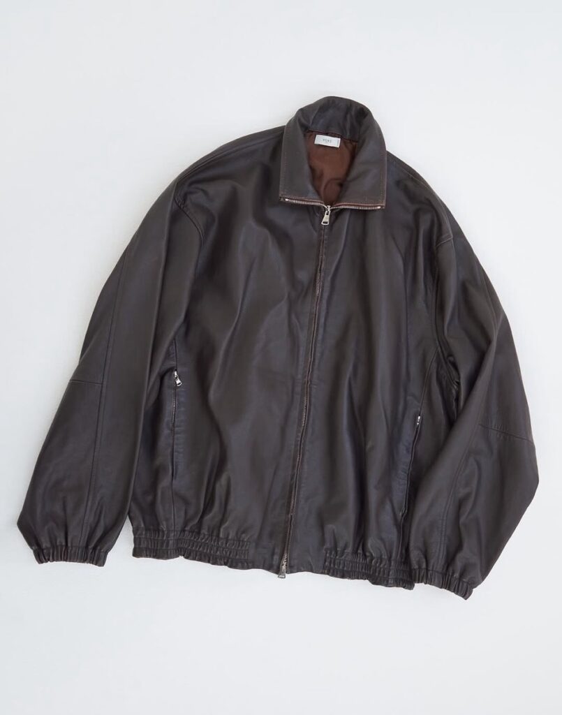 ラインナップの一点目は、カーフレザーを使用したトラックジャケット。一頭から取れる量の少なさから、希少性の高い高級革として知られるカーフレザーを初めて使用。生後6ヶ月以内の子牛の革は成牛と比較すると、部位による差や傷が少なく、薄く柔らかいのが特徴。また染色がしやすく、上品な光沢とキメの細かさから手触りの良い革。ゆったりとした身幅、アームホールを裾と袖口のゴムでキュッと絞りメリハリあるシルエットが特徴。昨シーズンも好評を博した品番をより上質な革でアップデートさせている。