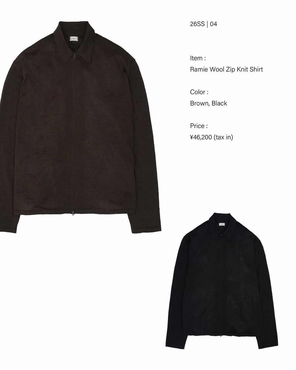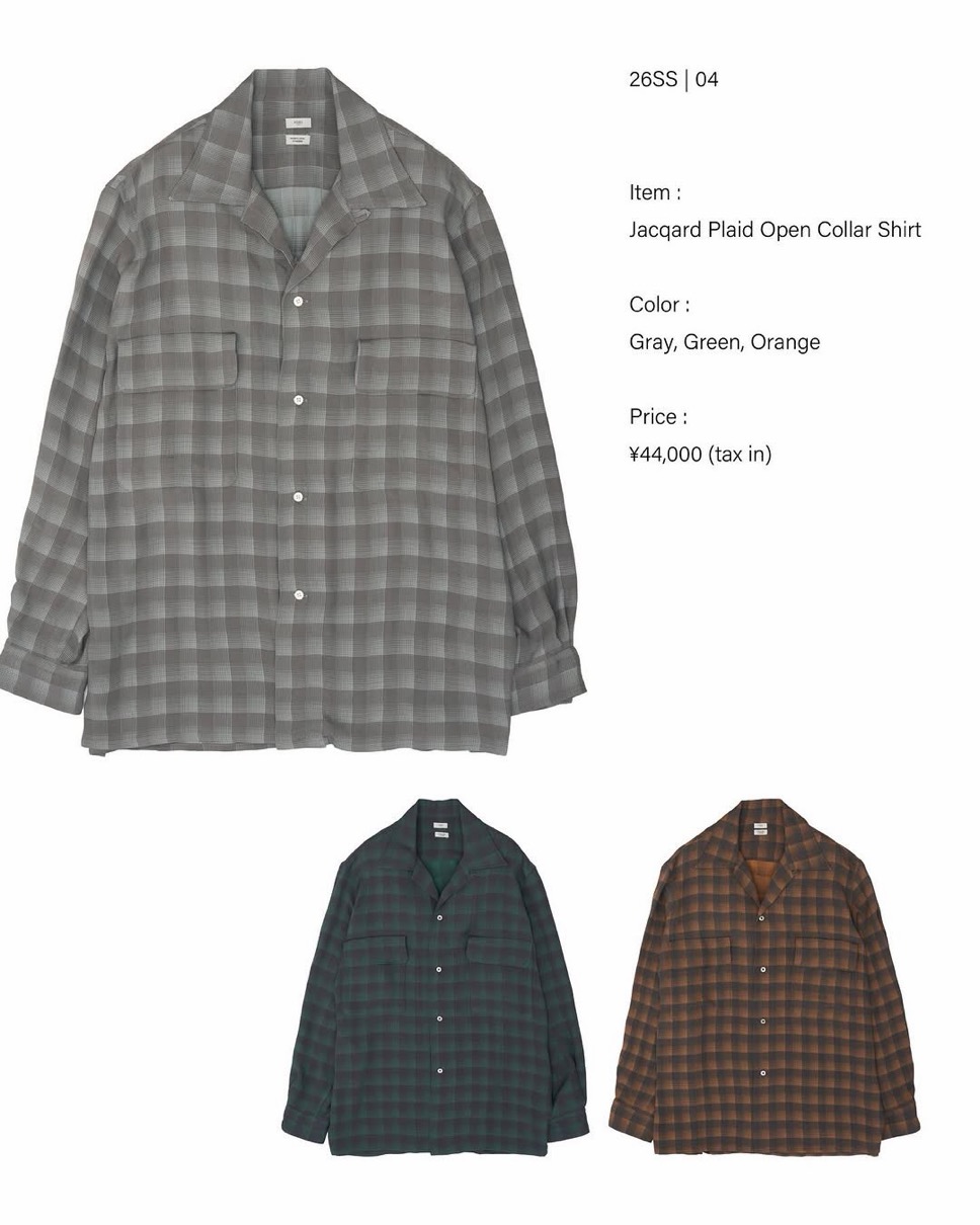 今季第四弾目となる新作では、全11型のアイテムが登場。人気を博してるドッキングシリーズからダック地とスウェット地を組み合わせたフーデットブルゾンはわアウターらしさがありながらもスウェットの軽い着心地を感じられる。シャツは昨年も人気だったコットンシルクツイルの製品染め、清涼感たっぷりのジャガードチェック地でオープンカラーが発売。ニットはシャリ感とハリがあるラミー/ウールで、Vネックとジップシャツの新型2型と、カーディガン、シャツがドッキングされたデザイン性高いアイテムも。