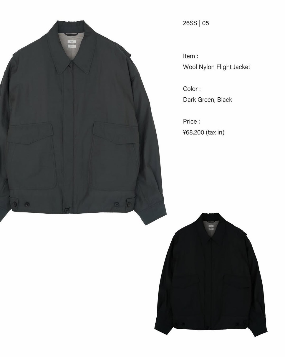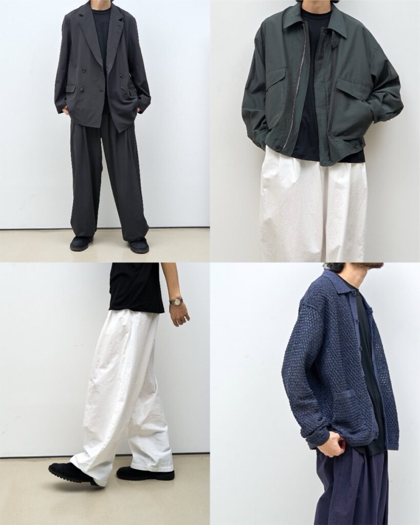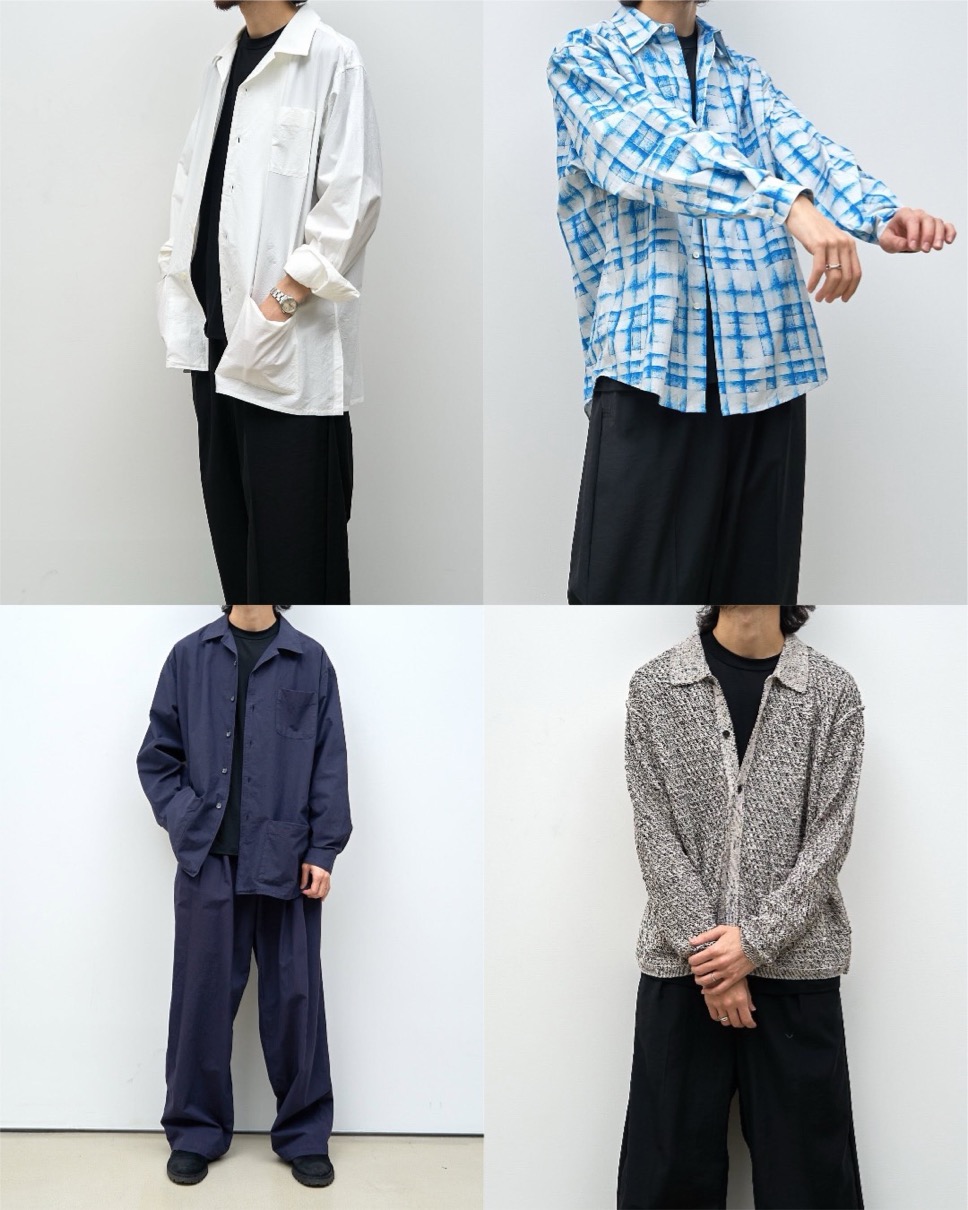 ニットは昨年に引き続いてコットンメッシュでシャツカーディガンとクルーネックの2型がリリース。程よい透け感と清涼感を楽しめるニット、新提案では軽く、薄いがハリがしっかりあるウールナイロン素材で人気のフライトジャケットとイージーパンツがリリース。天然繊維の上質さと合繊繊維の耐久性、扱いのし易さを兼揃えた良い生地となっている。