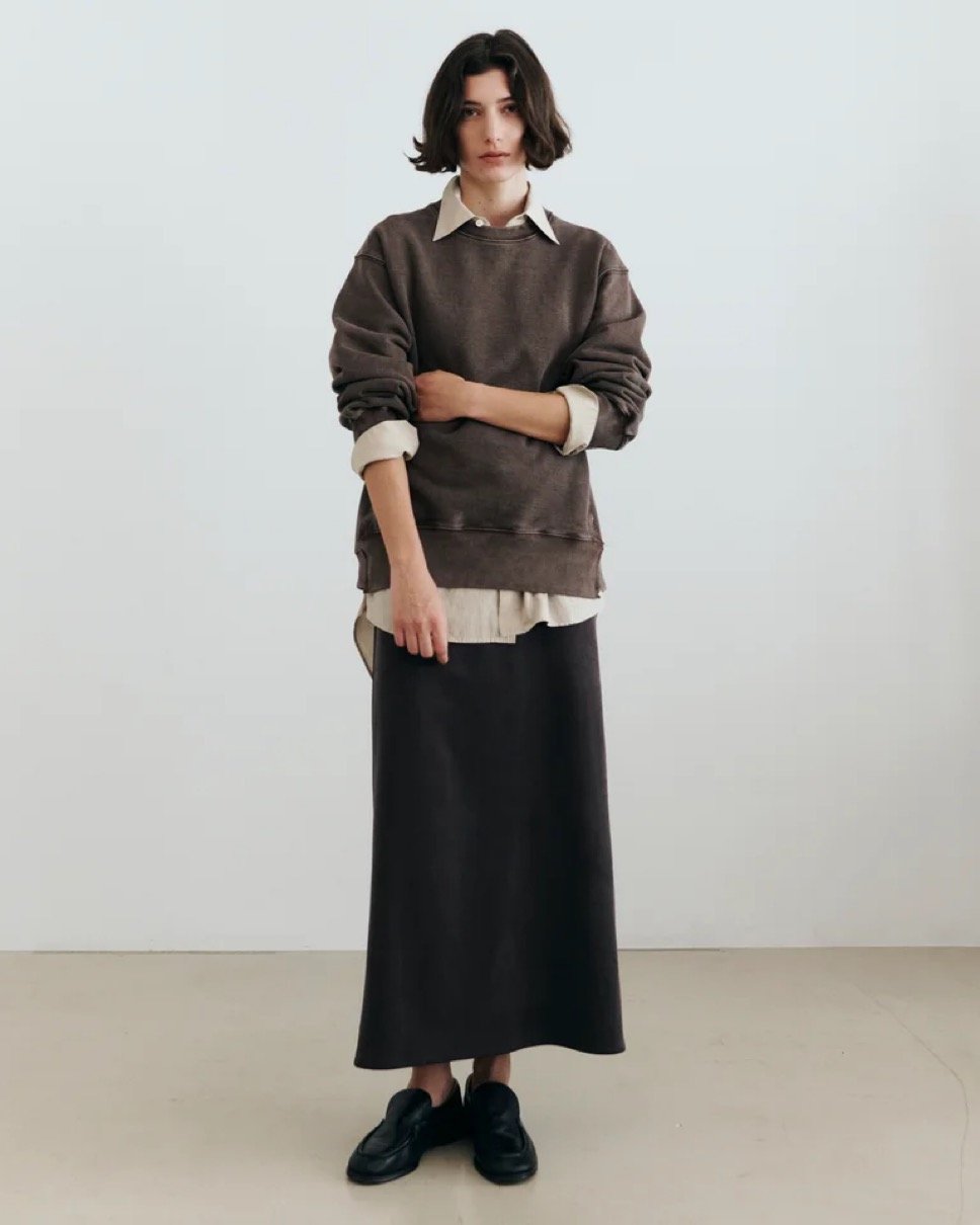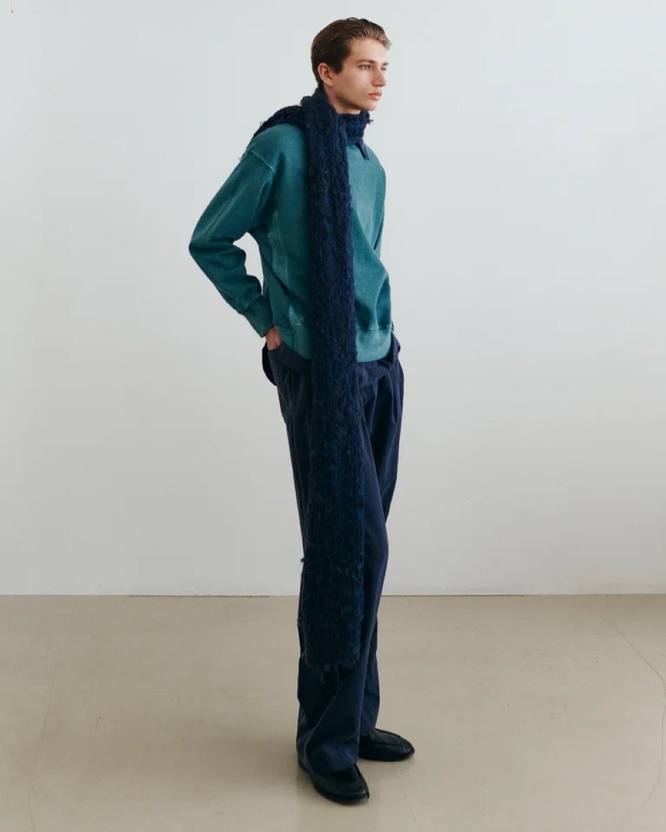 メインの素材には90年代のUSAのスエットをイメージしたようなドライタッチで肉厚なヴィンテージ感のある裏毛を使用。対照的に脇側には膨らみを持たせた30/8の少し肉厚でソフトな風合いの裏毛を使用。80〜90年代に見られる脇はぎがあるデザインに、40〜50年代に見られる丸胴のフリーダムスリーブの裏毛をドッキングしたようなデザインにしている。重なりの部分は全て3本張りで強度とデザイン性を持ち合わせ、染料顔料で製品染を施すことで、ヴィンテージになりすぎない品のある染めムラや褪色感を目指した。