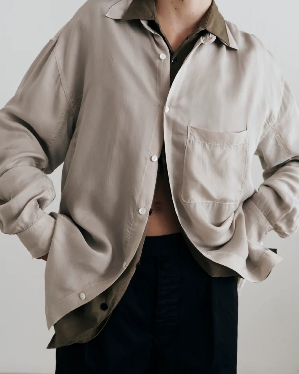 キュプラのシャツにコットンシルクボイルを異素材をドッキングし、製品で染料顔料加工で同色で染めている。2種類の素材の違いにより染まり方が異なるため色に濃淡差が出来奥行きを持たせたのが特徴。