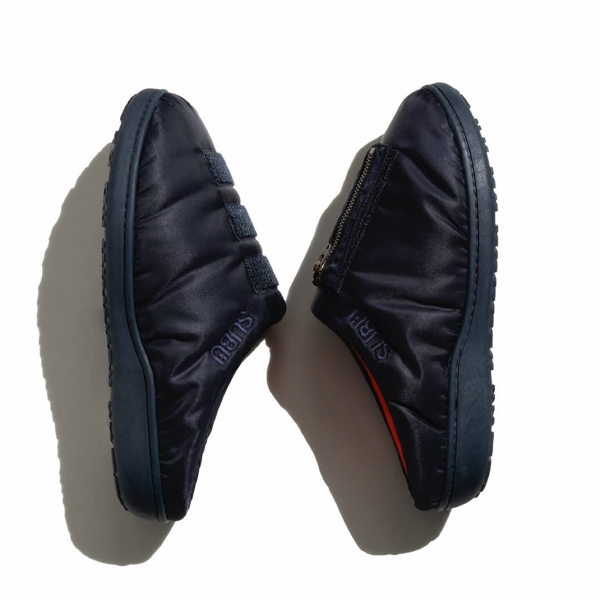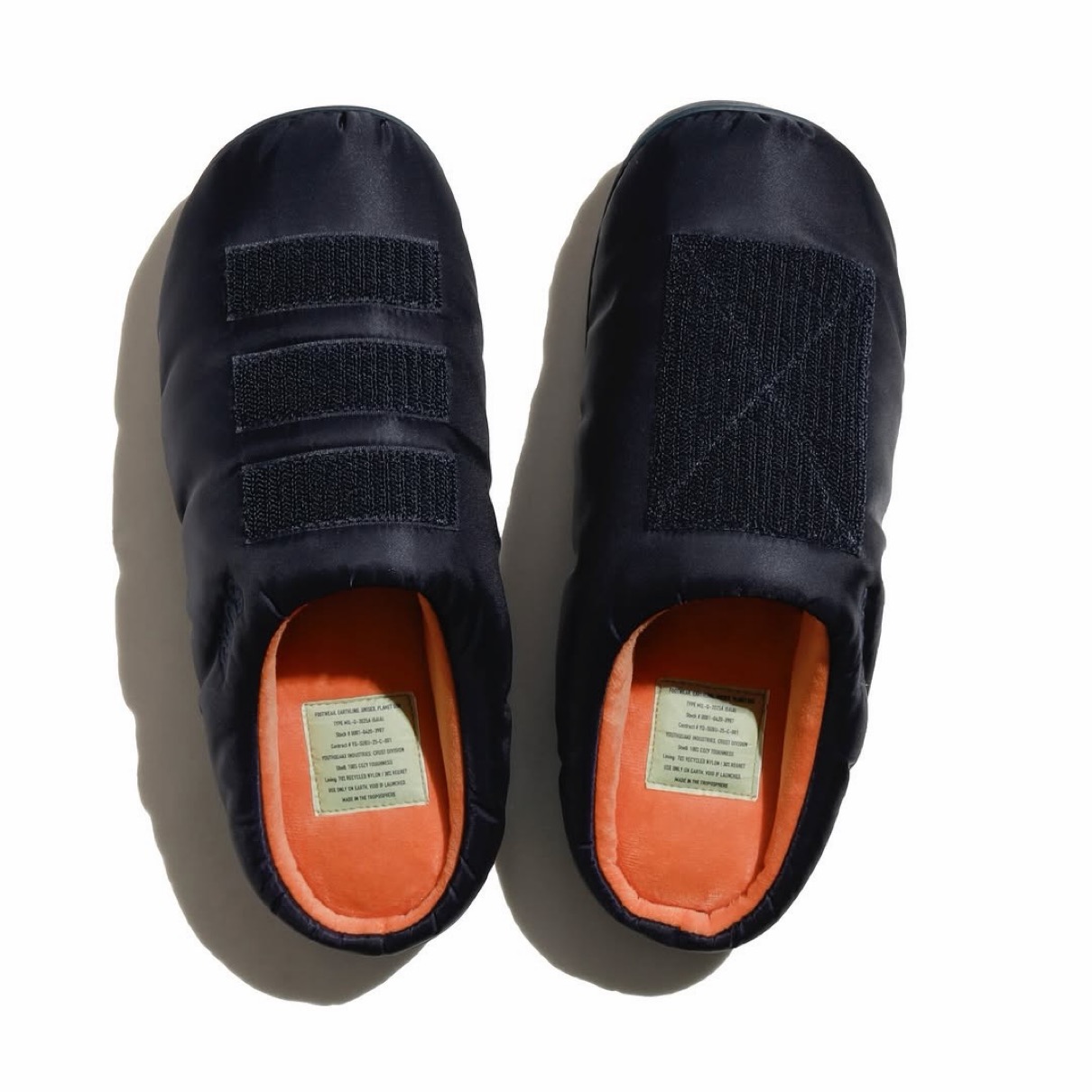 今回は2型のコラボモデルを展開しており、SUBUの定番モデル「ORIGINALS F-LINE」をベースに、ミリタリーウェアのMA-1より着想を得たモデルは、アッパー部分にはワッペンが着脱可能なディテールが入っており、YouthQuakeデザインのワッペンが3種類付属。